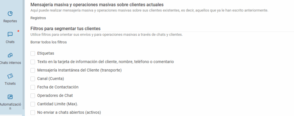 En el menú “Correos y operaciones masivas” , puede enviar correos a sus clientes actuales, así como realizar operaciones en los chats. La selección de clientes para correos u operaciones masivas se puede realizar según los siguientes criterios: