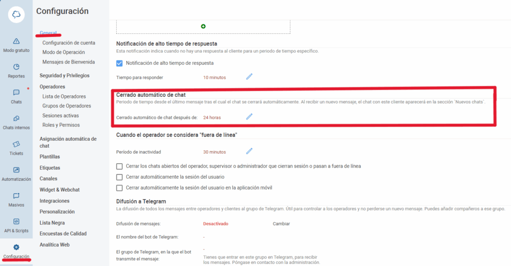 Puede configurar el autoclosing de chat en Configuración General y Chat. Establezca el tiempo después del último mensaje en el chat para que el chat se considere completo. Cuando este período expira, la sala de chat se cierra automáticamente.