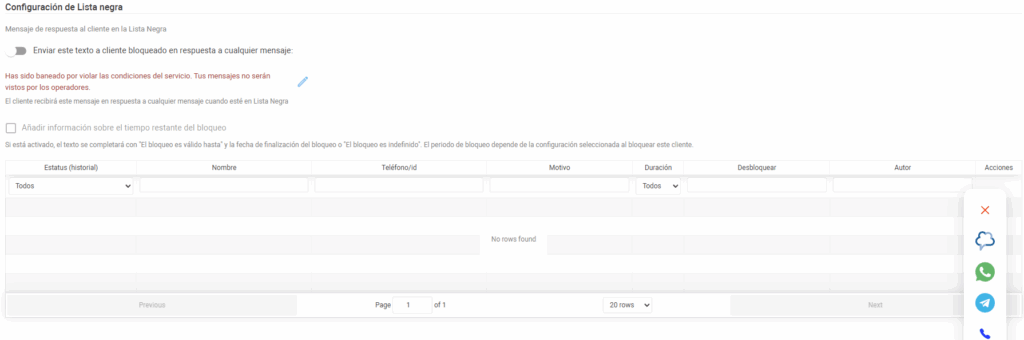 Con la ayuda de la Lista Negra, es posible bloquear a los clientes no deseados, por ejemplo, aquellos que envían spam. Los mensajes de los usuarios bloqueados no serán visibles en los chats. El bloque puede ser indefinido o establecido para un período específico.